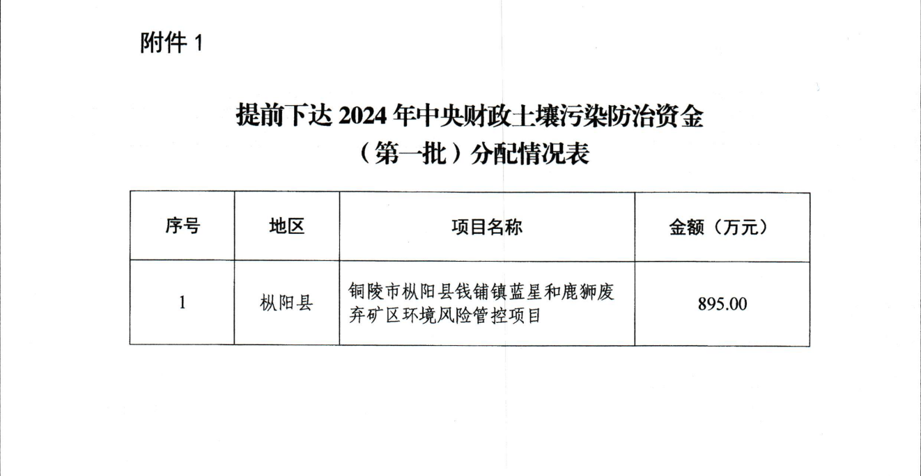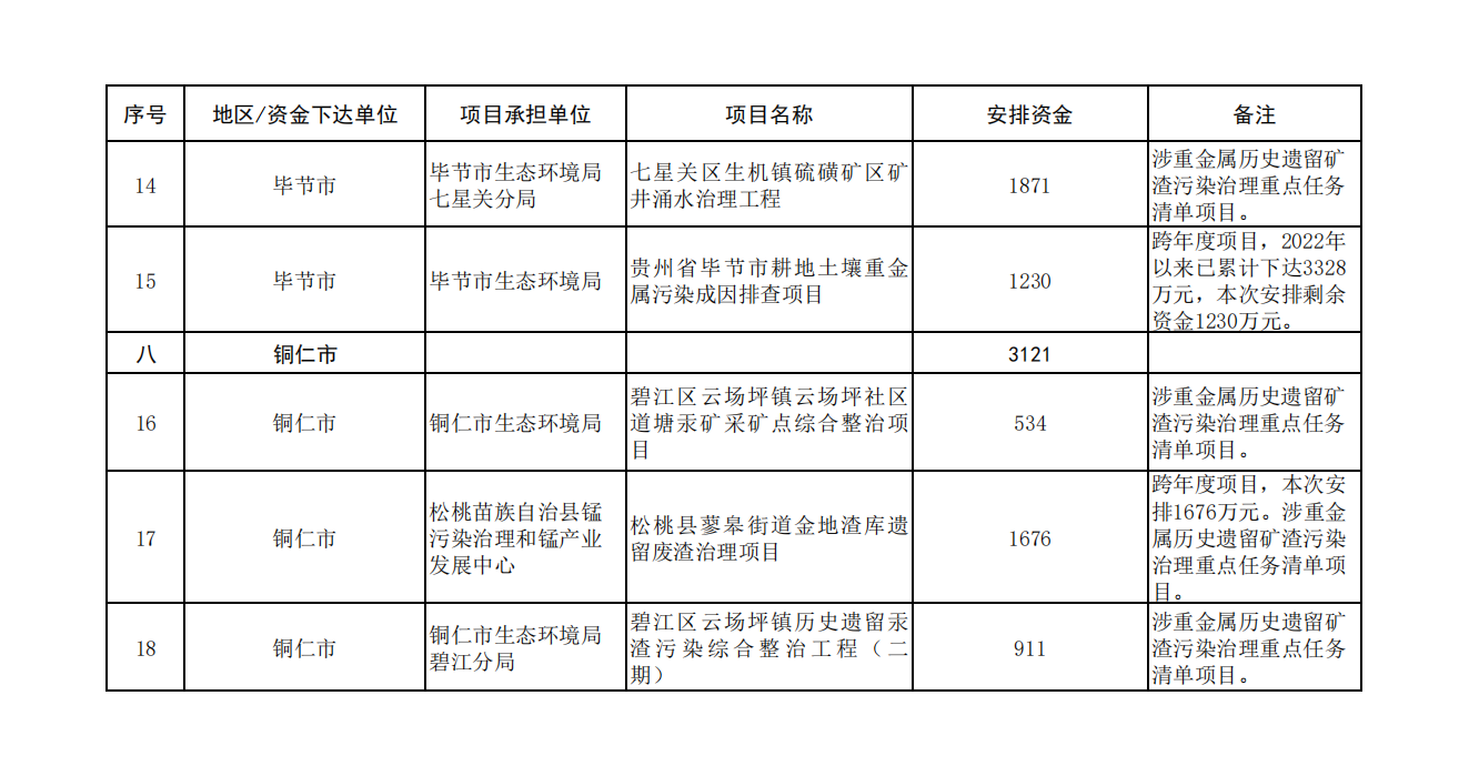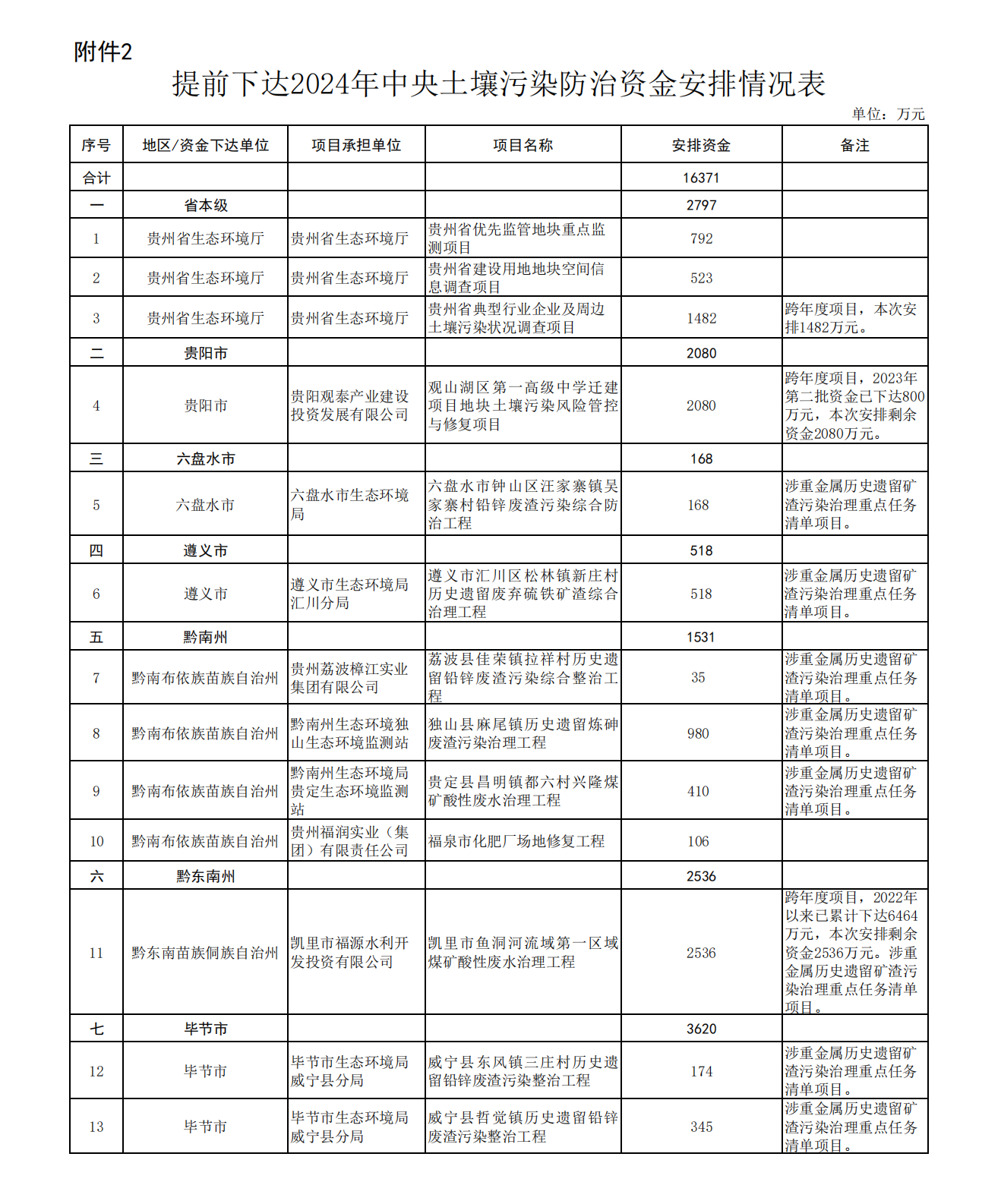 近日,河北、安徽、贵州省财政厅陆续发布提前下达2024年中央土壤污染防治资金预算的通知。河北省下达资金6962万元,用以支持石家庄市、张家口市、承德市的3个涉重金属历史遗留矿渣污染治理重点项目。安徽省下达资金895万元,用以支持铜陵市枞阳县钱铺镇蓝星和鹿狮废弃矿区环境风险管控项目。贵州省下达资金16371万元,用以支持贵州省本级、贵阳市、六盘水市、遵义市、黔南州、黔东南州、毕节市和铜仁市的18个项目。以下为具体资金安排情况。