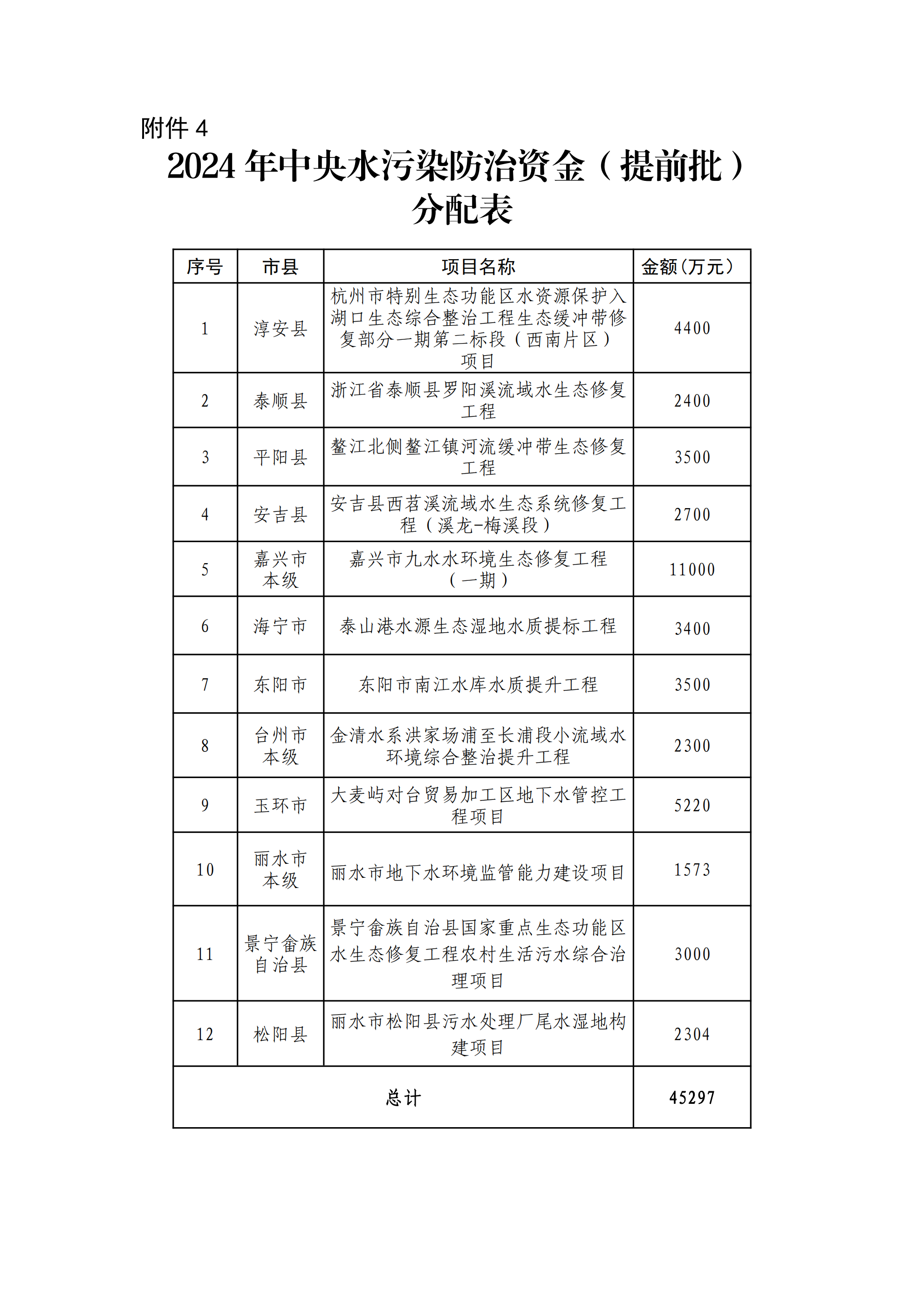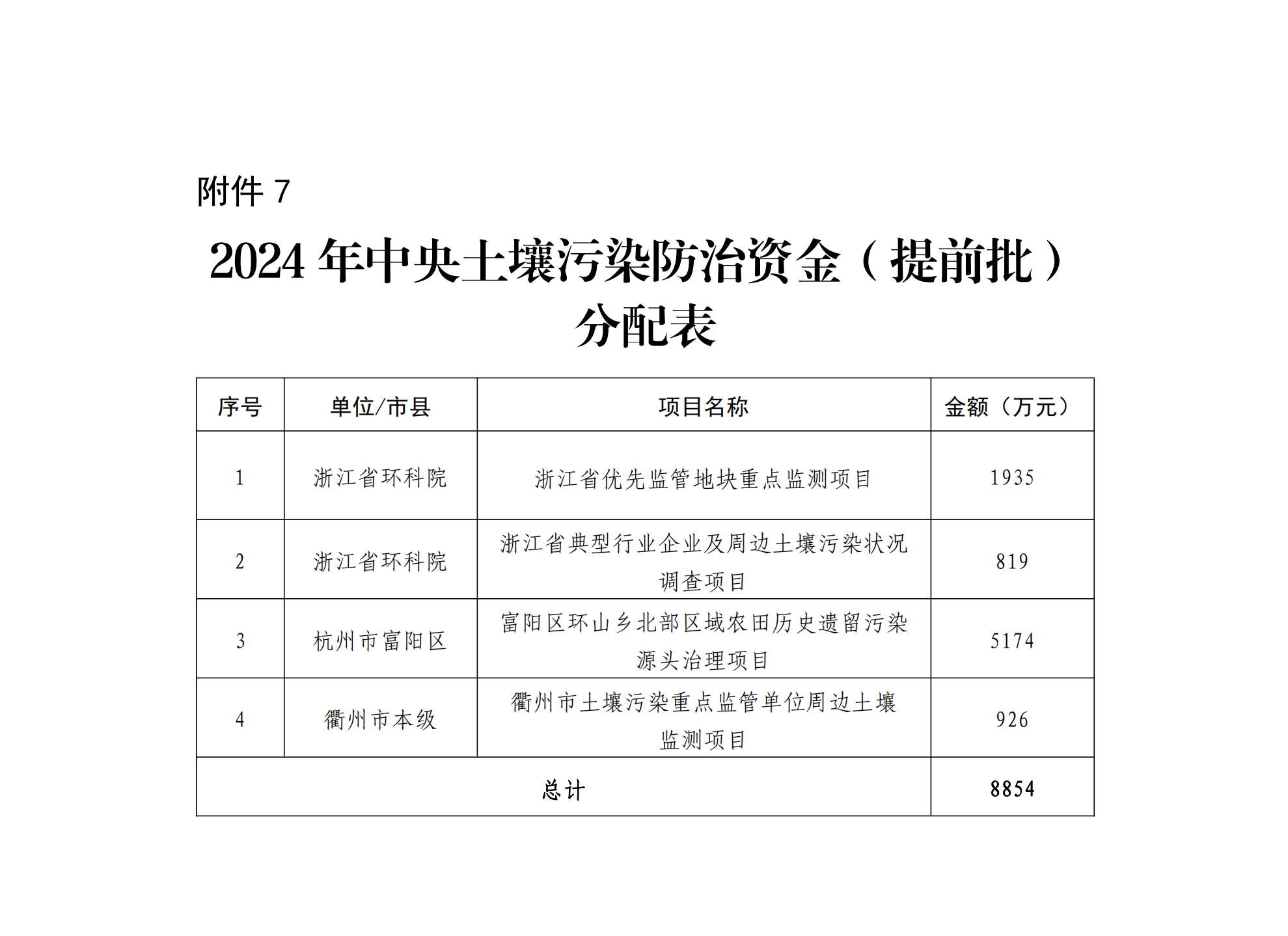 浙江省下达土壤污染防治资金8854万元,用以支持浙江省本级、杭州市和衢州市的4个项目;水污染防治资金45297万元,用以支持嘉兴市、台州市、丽水市、淳安县、泰顺县、平阳县、海宁市等12个项目。