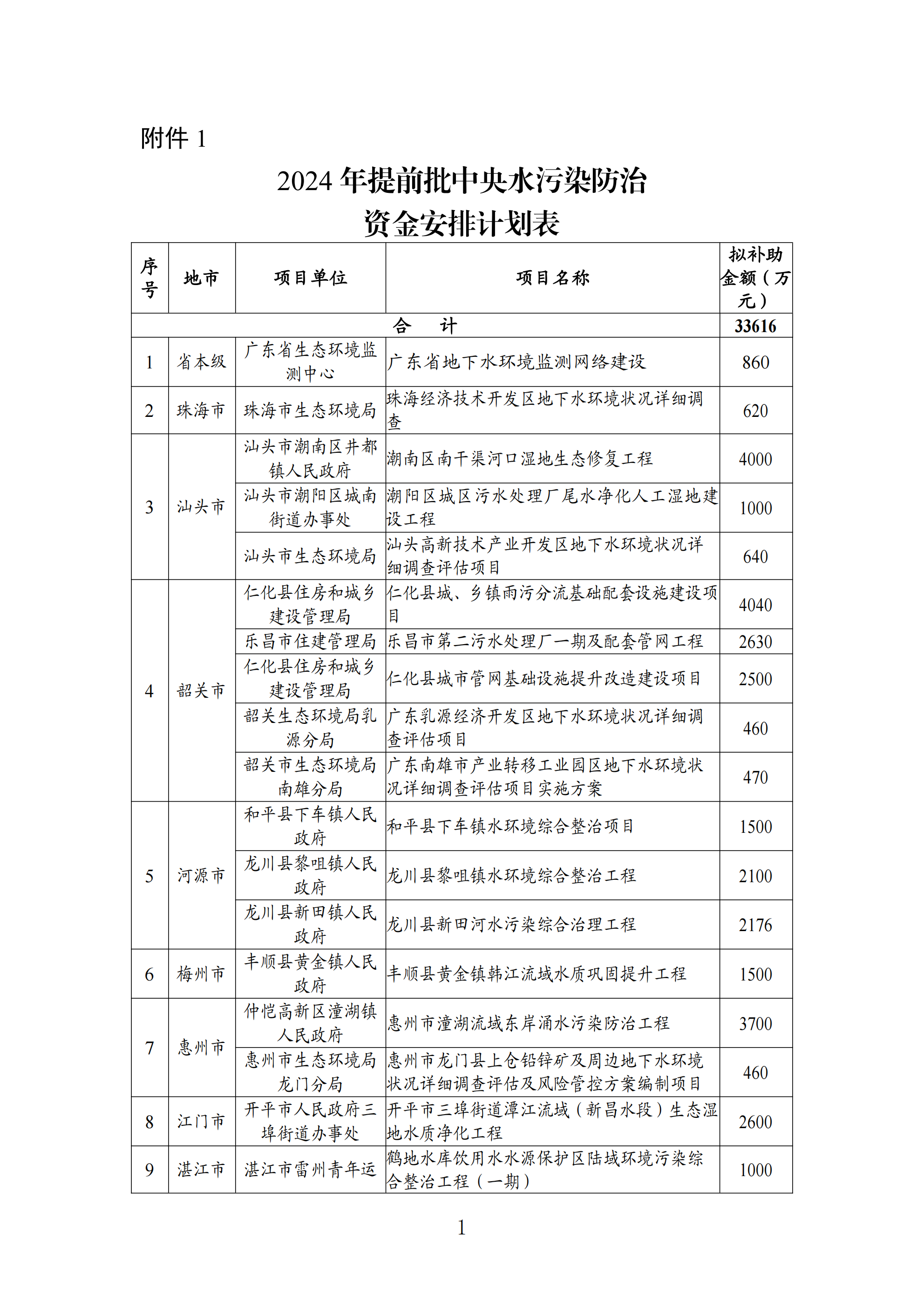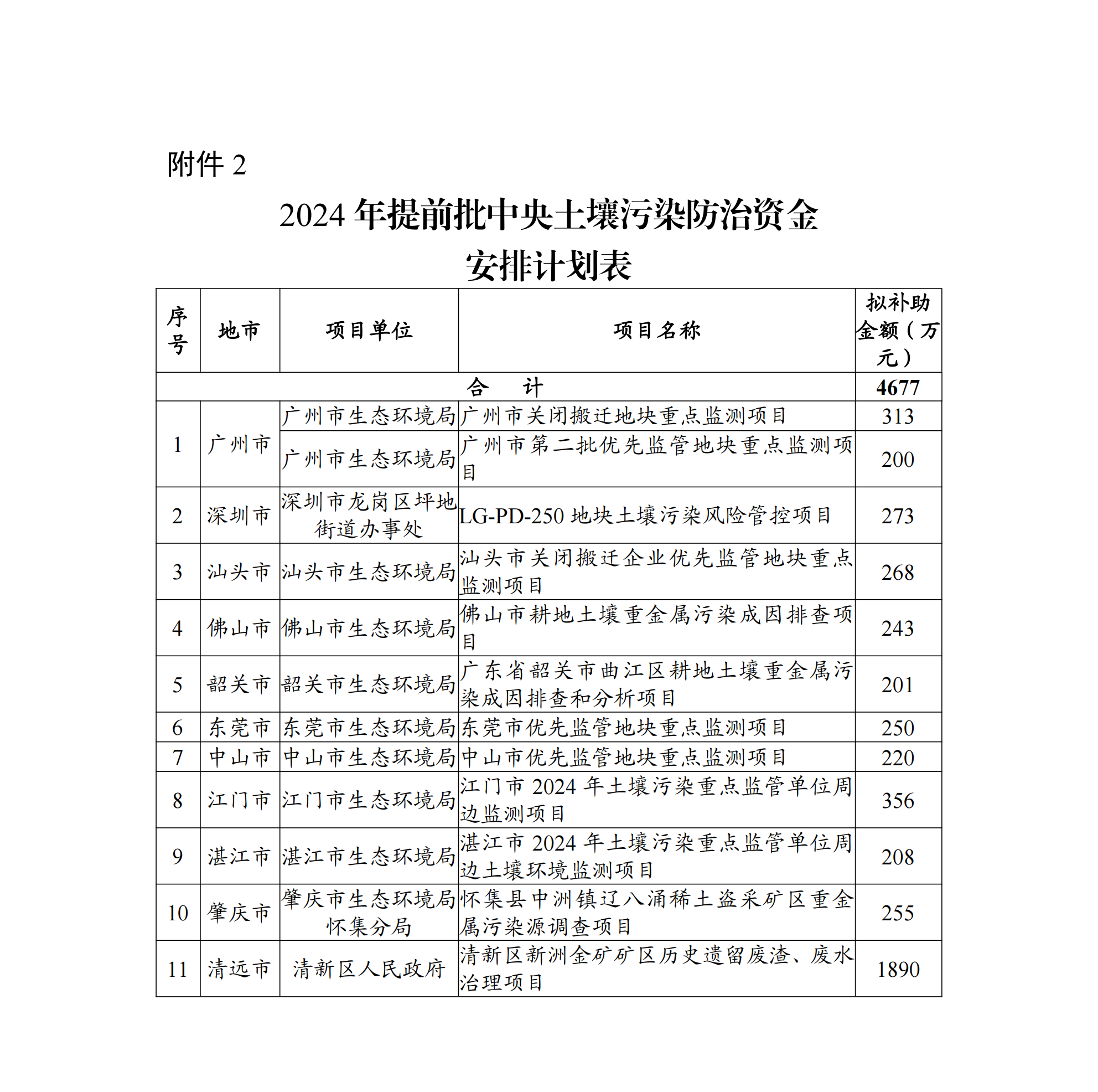 广东省下达土壤污染防治资金4677万元,用以支持广州市、深圳市、汕头市、佛山市、韶关市、东莞市等11个市的12个项目;水污染防治资金33616万元,用以支持广东省本级和珠海市、汕头市、韶关市、河源市等9个市的20个项目。